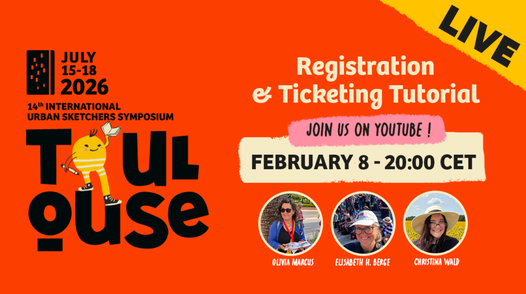 Join Olivia Marcus, Elisabeth H. Berge, and Christina Wald to discuss registration for the 14th Annual Urban Sketchers Symposium in Toulouse.